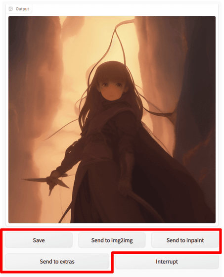 생성된 이미지의 하단에는 이미지를 다루는 버튼이 여러 개 표시됩니다. 「Save」라고 하면, 생성된 화상을 정리해 「log/images」안에 CSV 파일과 함께 보존합니다. 생성된 이미지 중 하나를 선택하고 “Send to img2img”를 누르면 “img2img” 탭으로 보내집니다. 마찬가지로 "Send to inpaint"라면 "img2img"탭의 인페인팅 기능으로 보내지므로 이미지의 일부분에 마스킹을 걸 수 있습니다. "Send to extras"라면 "Extras"탭으로 보내집니다.