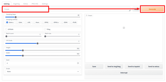 「일단, 뭔가 이미지를 만들고 싶다」라고 하는 경우, 「Prompt」 입력란에 원하는 이미지에 관한 문자열을 입력해 「Generate」를 누르면 됩니다.
