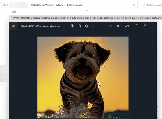 이 txt2img-images에 저장되어 있는 파일은 이름에 생성 시의 프롬프트가 자동으로 삽입되고, 메타데이터로서 시드 값이나 생성 시의 설정이 포함되어 있기 때문에 같은 설정으로 이미지 재생성이 가능합니다.