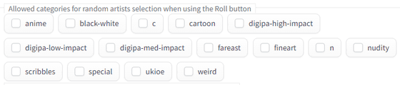 아티스트는, 「Setting」 탭 내의 아래쪽에 있는 카테고리에 체크를 넣으면, 특정 카테고리의 사람을 등장시키는 것이 가능합니다. 예를 들어 amime라면 오토모 카츠히로와 데미즈 포스카 등의 이름이 나왔습니다만, 반드시 애니메이션이나 만화에만 한정되지는 않는 것 같습니다. 또 「c」나 「n」등의 수수께끼의 카테고리도 있습니다.