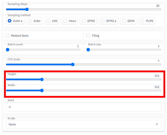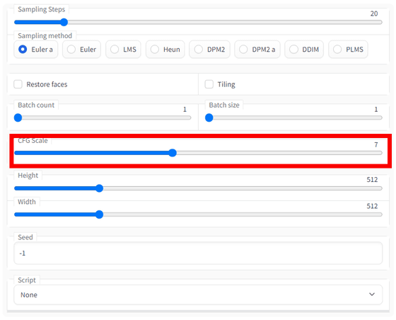 「Height」와 「Width」는 출력 화상의 사이즈. 원래 모델이 512 × 512에 최적화되어 있기 때문에 가장 고품질의 이미지가 생성되는 것은 512 × 512입니다. 또한 이미지 크기는 그대로 VRAM의 사용량에 반영되기 때문에 「512 × 832처럼 조금 큰 이미지를 만들고 싶다」는 경우, VRAM이 적으면 에러가 발생하면서 생성되지 않는 경우가 있습니다.