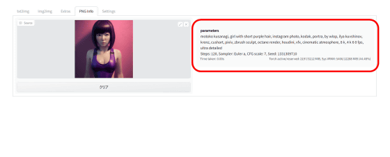 이미지에 포함된 메타데이터를 다시 사용하려면 'PNG 정보' 탭을 열고 이미지를 드래그 앤 드롭합니다.