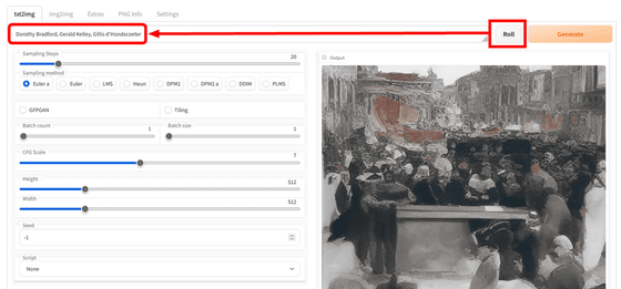 프롬프트 열의 오른쪽에 있는 Roll은 이미지 생성을 위한 프롬프트에 임의의 아티스트 이름을 추가합니다. 한 번 누를 때마다 한 명씩 추가됩니다.