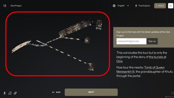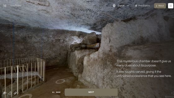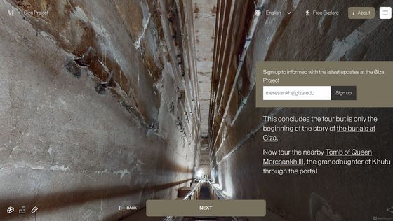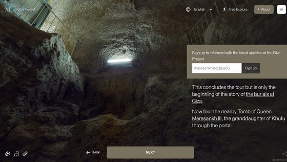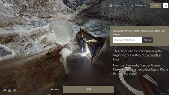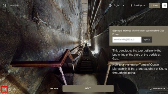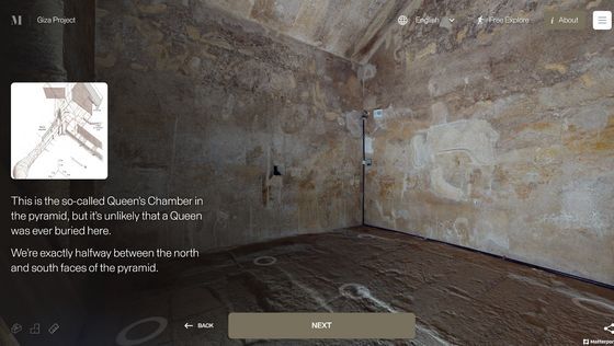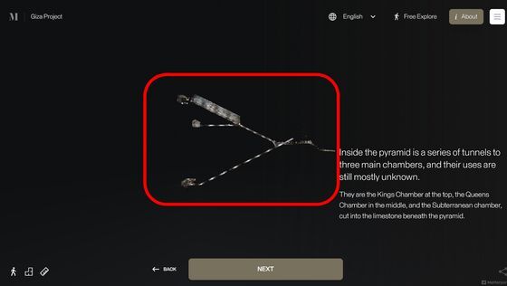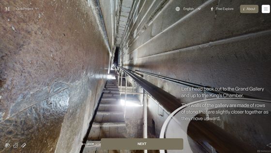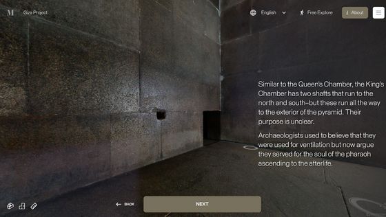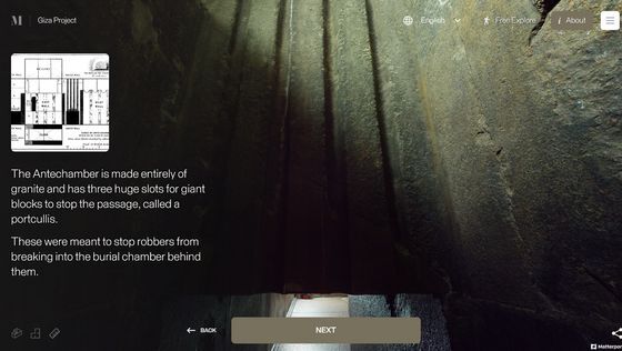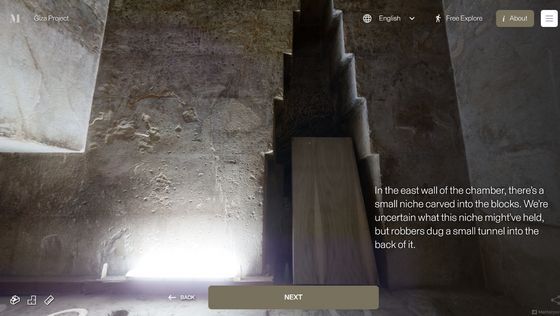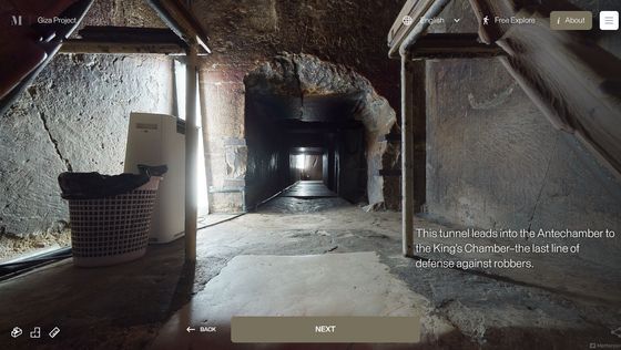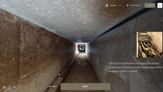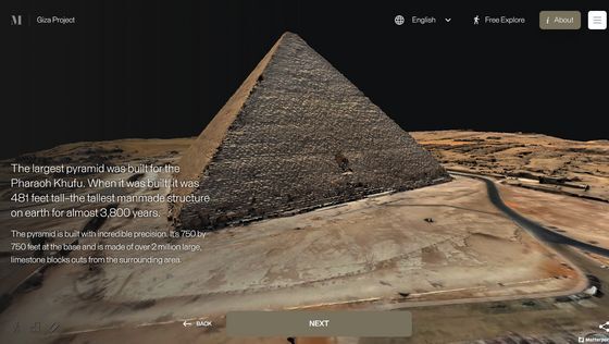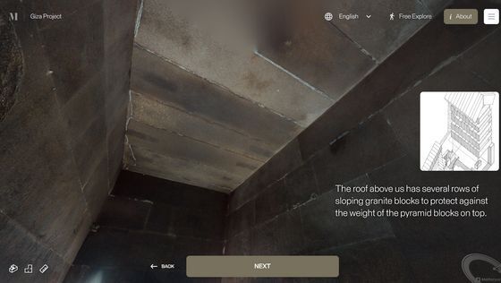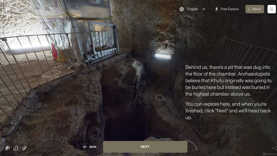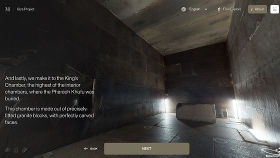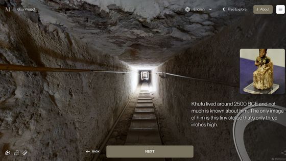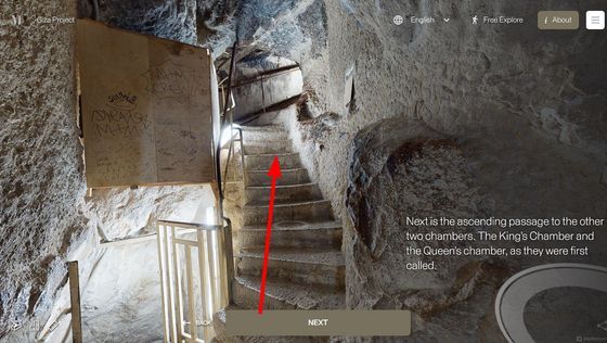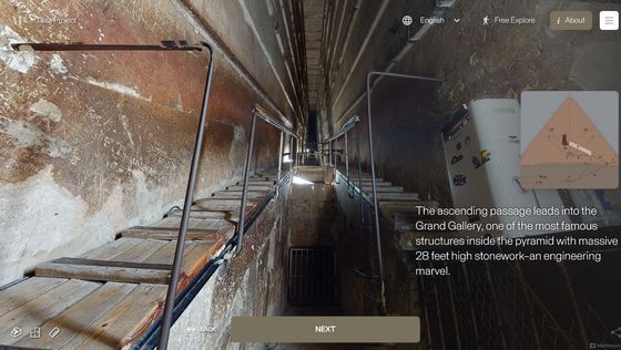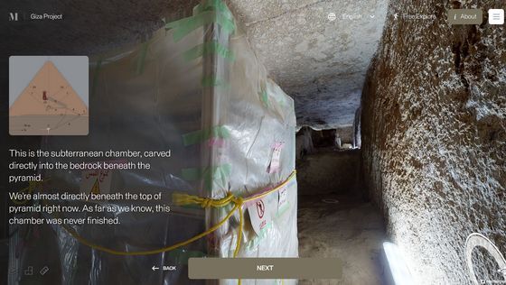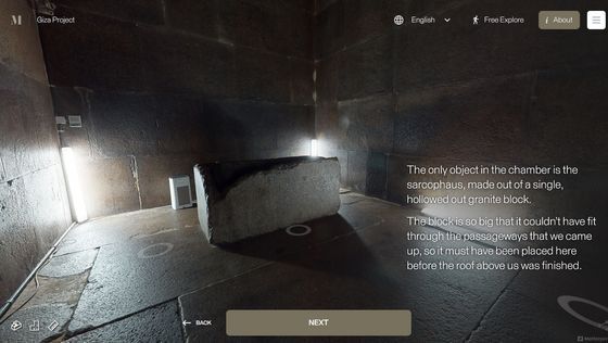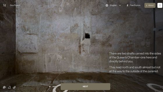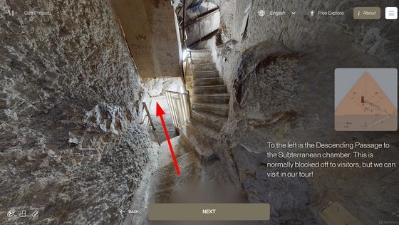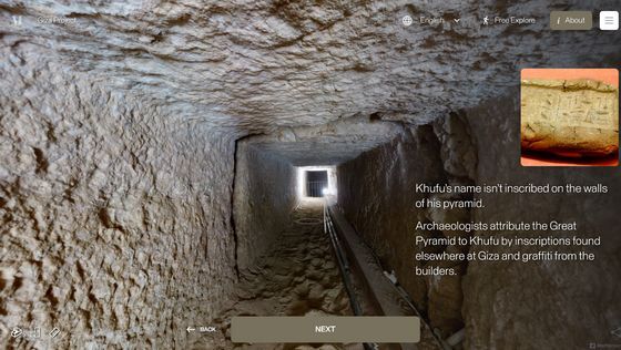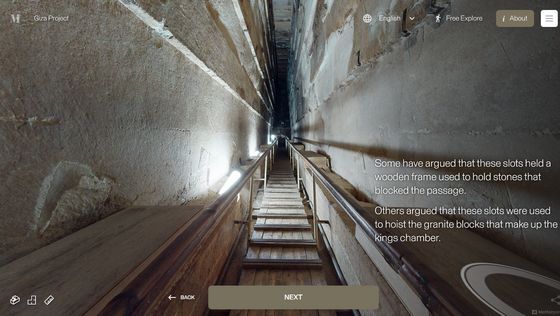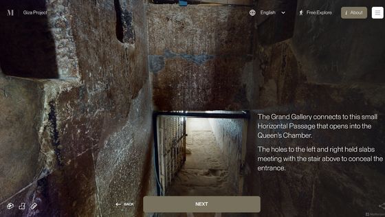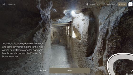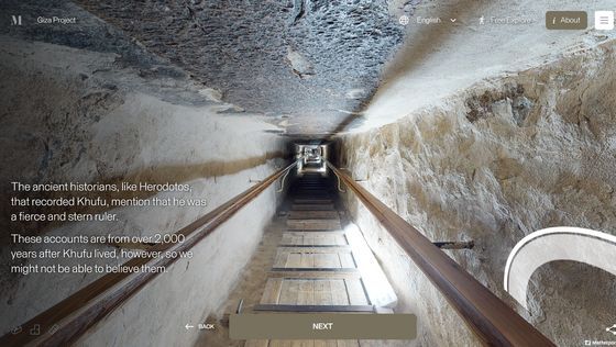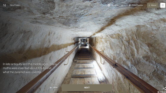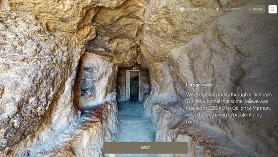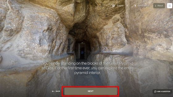 Enter the Pyramid를 누르면 피라미드 입구 앞으로 시점이 이동합니다. 화면에는 「당신은 기자의 대 피라미드 블록 위에 서 있습니다. 사상 처음으로, 피라미드 내부를 전부 탐색하는 것이 가능해졌습니다」라는 텍스트가 표시되고 있어, 우선은 화면의 텍스트를 봐 가면서 피라미드 내의 견학 투어를 체험할 수 있습니다. 「NEXT」를 클릭하면...