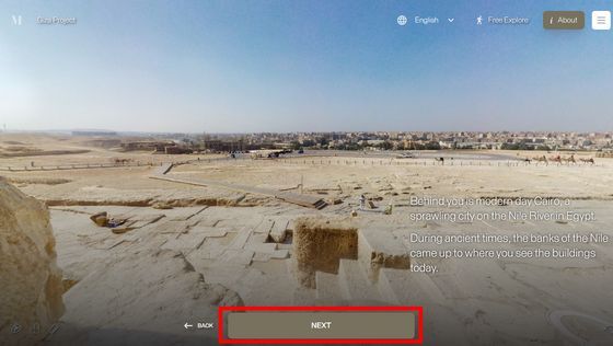 입구에서 뒤돌아 보면, 배후에 보이는 카이로의 거리와 나일강의 소개가 나옵니다. 「NEXT」를 눌러 투어를 계속해 가는 것도, 버튼은 누르지 않고 시점이나 위치를 바꾸어 견학하는 것도 가능.