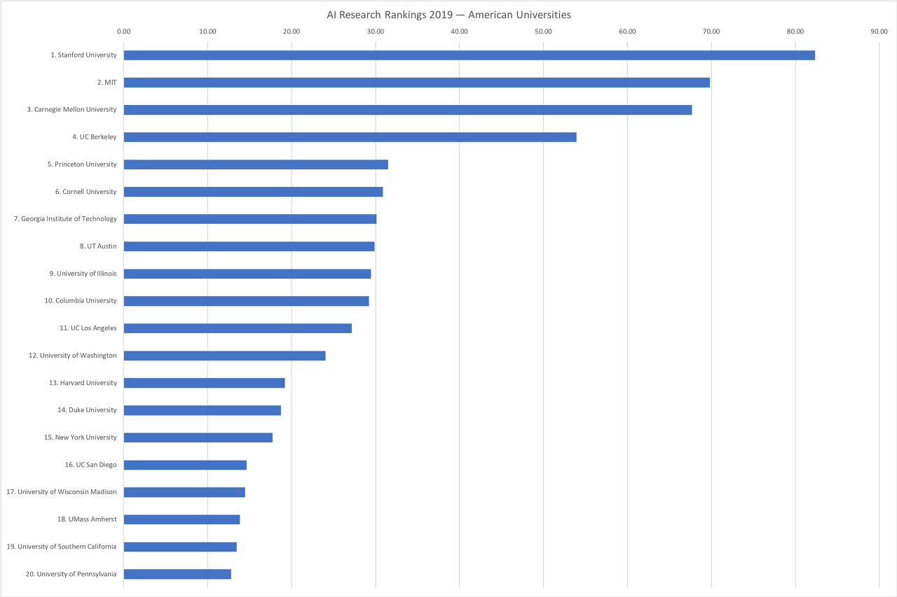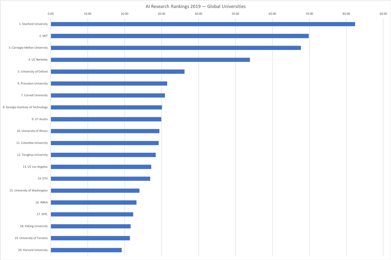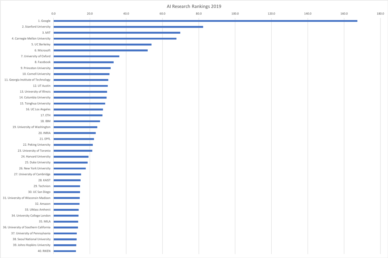 2019년의 AI 연구를 선도하는 세계의 상위 대학 20
