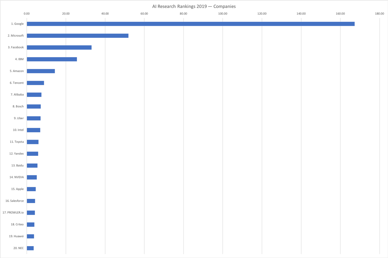 AI 연구를 선도하고 있는 것은 미국이며, 미국의 대학과 기업이 발표한 논문이 많이 채택되고 있다. Google은 AI를 연구로 세계 각국의 유명 대학을 크게 능가하고 있다.