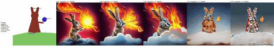 Attension의 가중치 조정이 강할수록 원본 프롬프트와 구도에 충실한 이미지를 생성할 수 있습니다. 그러나 그만큼 이미지의 품질은 떨어집니다. 아래의 이미지는 오른쪽으로 갈수록 가중치 조정이 강해지고 있어, 구도는 밑그림 이미지에 충실해져 갑니다만, 생성되는 토끼의 노이즈가 증가해 버리고 있습니다.