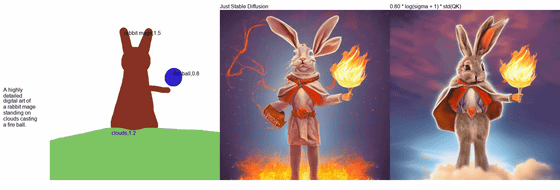 세 개의 이미지 중 가장 왼쪽에 있는 것은 이미지의 구도를 지시하는 밑그림입니다. 이 프롬프트와 밑그림 이미지로 지시를 보내, Stable Diffusion으로 생성한 이미지가 중간 이미지. 그리고, 프롬프트에 의해 노이즈 제거의 방향을 실시하는 「Attension」의 가중치를 도중에 조정하는 eDiffi와 같은 처리를 도입한 것이 오른쪽의 이미지입니다.
