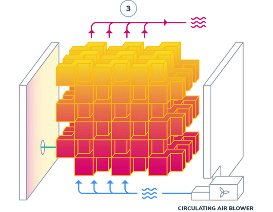 Rondo Energy가 개발한 축열 시스템은 '벽돌'을 사용합니다. 이 시스템에 전원이 공급되면 전기 히터가 발열하여 주변 물체를 빠르게 가열합니다. 수천 톤의 벽돌이 이 열방사에 의해 직접 가열되어 1일당 1% 미만이라는 매우 낮은 손실로 수시간 ~ 며칠에 걸쳐 에너지를 축적한다는 것. 가열된 벽돌에 공기를 불어넣는 것으로 가열된 공기를 바탕으로 한 수증기 터빈을 돌려 발전할 수 있다고 합니다.