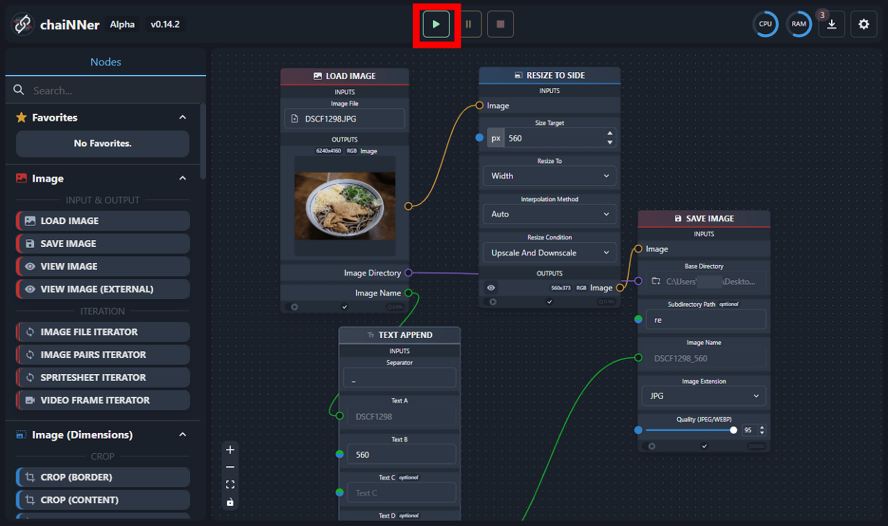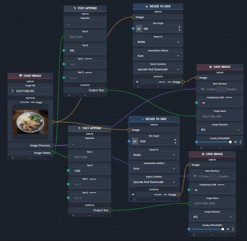 chaiNNer에서는, 1장의 이미지를 기점으로 복수의 처리를 병렬 실행하는 것도 가능합니다. 예를 들어, 아래는 "이미지를 가로 560픽셀과 가로 1200픽셀로 리사이즈하고 각각 다른 이름으로 저장"이라는 처리를 실행하고 있습니다.