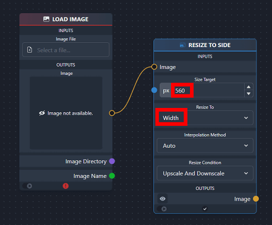 노드에는 오렌지나 녹색의 원이 붙어 있어, 동그라미끼리 연결할 수 있습니다. 예를 들면, 아래의 예에서는「LOAD IMAGE」로 읽어 들인 이미지를「RESIZE TO SIDE」에 건네주어 「가로폭을 560픽셀로 수정」이라는 명령을 실행시키고 있습니다.