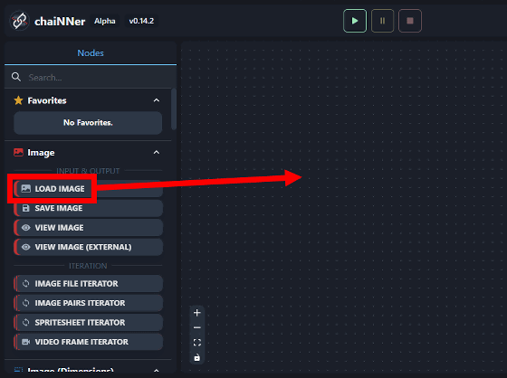 chaiNNer에서는 화면 왼쪽에 즐비한 '노드'를 조합하여 처리 내용을 조립합니다. 각 노드는 드래그 앤 드롭으로 화면 오른쪽 영역에 끌어와서 사용합니다.