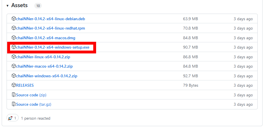먼저 릴리즈 페이지로 이동하여 chaiNNer 설치 프로그램을 다운로드합니다. chaiNNer-0.14.2-x64-windows-setup.exe 를 다운로드했습니다. 파일 크기는 90.7MB.