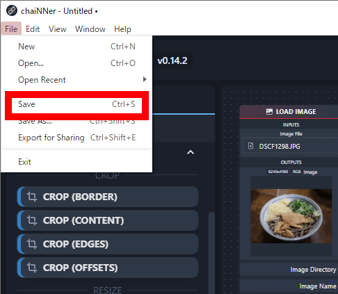 작성한 처리는「File」 메뉴 내의「Save」명령으로「. chn」 형식의 파일로 보존할 수 있습니다. 처리 내용을 저장해 두면 입력 이미지를 지정하는 것만으로 복잡한 처리를 한 번에 실행할 수 있습니다.