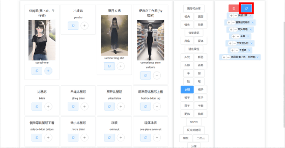 「프롬프트 조각」을 조합하는 방법은 아래와 같습니다. 먼저 화면 오른쪽에서 카테고리를 선택하고 화면 왼쪽에 표시되는 "프롬프트 조각"의 하단에 배치된 "+"버튼을 클릭합니다. 그러면 선택한 "프롬프트 조각"이 오른쪽 목록에 추가됩니다.