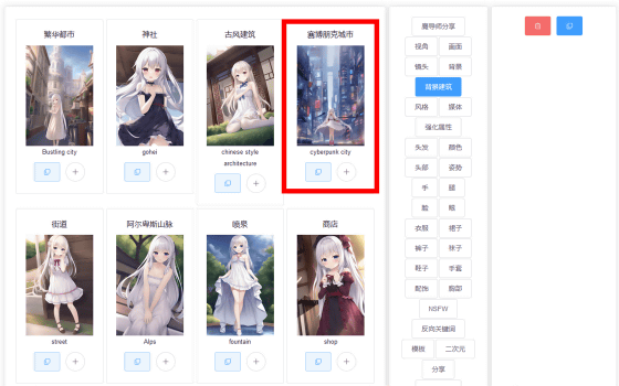 카테고리는「배경」,「헤어스타일」,「복장」등이 준비되어 있어「사이버펑크 한 배경이 좋다」,「머리카락은 검정이 좋다」등 생성하고 싶은 이미지의 특징을 세세하게 지정할 수 있습니다.