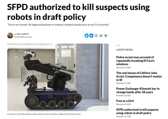 최근 경찰에 의한 로봇의 도입이 논란을 일으키고 있으며, 비영리 조직인 전자 프런티어 재단은 "경찰이 무장 드론이나 무장 로봇을 갖추지 말아야 한다"라고 경고하고 있습니다. 그런 가운데, 샌프란시스코시 경찰이 샌프란시스코시의 시의회에 상당하는 감리 위원회에 제출한 새로운 정책 초안에,「로봇을 사용한 용의자 살해」를 허가하는 문언이 포함되어 있었다는 것이 보도되었습니다.