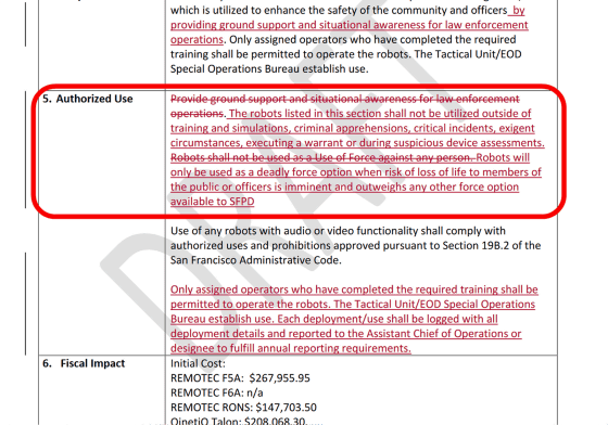 그래서 관리위원회의 의장을 맡고 있으며 정책 책정에 종사하는 규제위원회의 멤버인 아론 페스킨은 "로봇은 어떠한 인간에게도 힘을 행사해서는 안 된다."는 문장을 넣어서 샌프란시스코시 경찰의 로봇 사용을 제한하려고 했습니다. 그런데 정책 초안의 (PDF 파일) 아카이브를 보면 페스킨 씨가 제안한 문언이 경찰에 의해 삭제되고 대신 "로봇은 일반 시민이나 경찰관의 생명이 잃어버릴 위험이 임박하였고, 샌프란시스코시 경찰이 이용할 수 있는 다른 무력 행사의 선택을 웃도는 경우에 대해서만 살상력이 있는 무력행사의 선택지로 사용된다고 되어 있습니다.