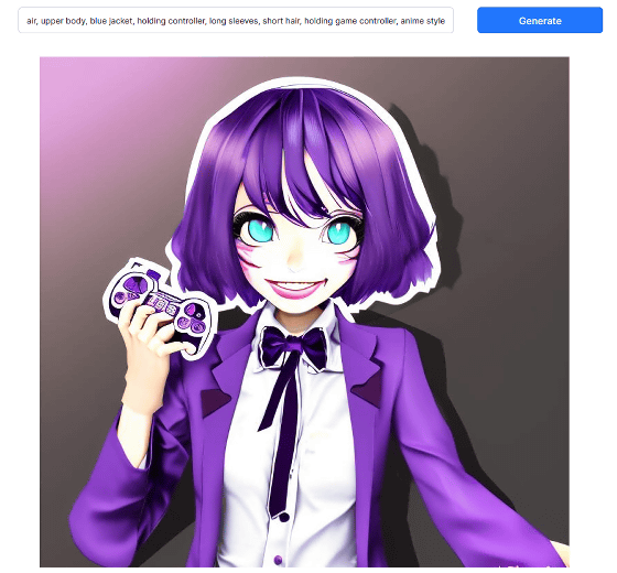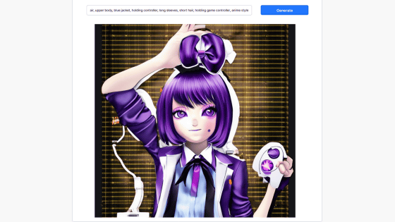 「1girl, solo, smile, bow, jacket, :d, controller, hairband, holding, bowtie, bangs, blazer, shirt, purple eyes, open mouth, school uniform, looking at viewer, game controller, purple hair, upper body, blue jacket, holding controller, long sleeves, short hair, holding game controller」라는 프롬프트를 입력하여 Stable Diffusion 2.0에서 이미지를 생성하면 이렇습니다. 손가락 모양과 게임 컨트롤러 모양이 부자연스럽습니다.