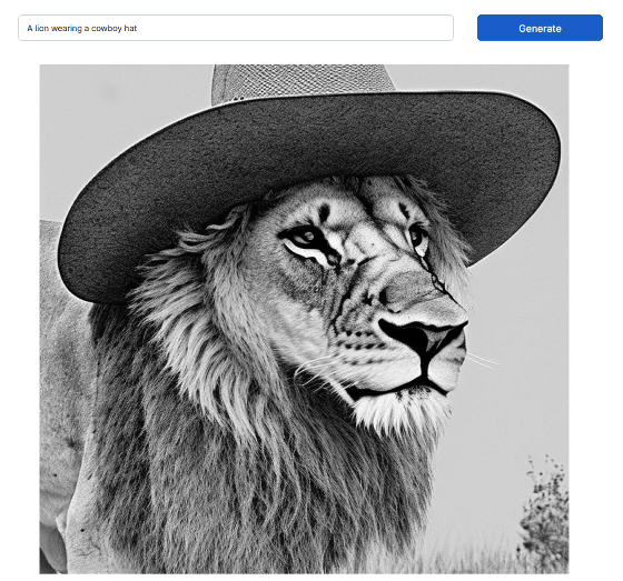 이번에는 위의 입력 예에 기재되어 있는 프롬프트「A lion wearing a cowboy hat」를 입력해 보았습니다.