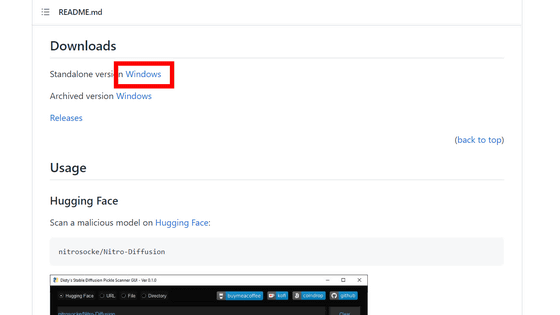 Stable-Diffusion-Pickle-Scanner-GUI는 악성 모델 파일을 스캔하고 감지하는 'Python Pickle Malware Scanner'를 GUI(그래픽 사용자 인터페이스)로 실행할 수 있는 도구로 GitHub에 공개되어 있습니다. GitHub의 README.md에서 "Downloads"에서 다운로드가 가능합니다.