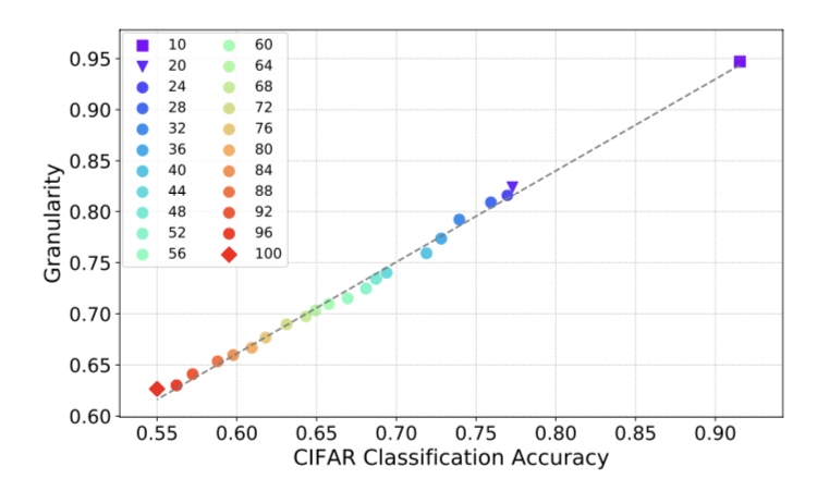 가장 오른쪽의 보라색 사각형은 CIFAR10의 분류정확도와 입도의 관계를 나타내고, 그 이외는 CIFAR100의 분류정확도와 입도의 관계를 나타냅니다.