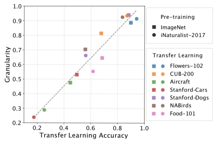 그림 5에 따르면, 입도와 전이 학습의 정확도는 높은 상관관계가 있고, 입도가 클수록 전이시키기 쉬운 것을 알 수 있습니다. 또한 입도는 원래의 학습 데이터에 크게 의존하고 있음을 알 수 있습니다. 예를 들어, Stanford- Dogs의 입도는 ImageNet에서 학습한 모델이, iNaturalist-2017에서 학습한 모델보다 크다는 것을 알 수 있습니다.