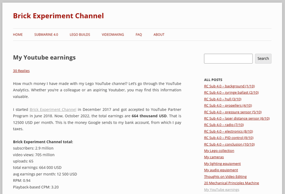 YouTube에서 레고 작품을 투고하고 있는 'Brick Experiment Channel'이 지난 5년에 걸친 채널 운영 수익을 적나라하게 공개하고 있습니다.