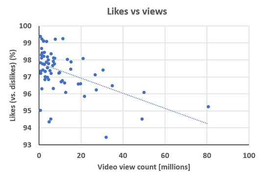 Brick Experiment Channel은 이 외에도 많은 데이터를 공개합니다. 예를 들어 다음은 동영상의 고평가 비율(가로축)과 조회수(가로축)를 나타낸 그래프로, 대개 조회수가 늘어나 많은 사람이 본 동영상일수록 저평가를 받는 비율이 증가하는 것을 볼 수 있습니다.