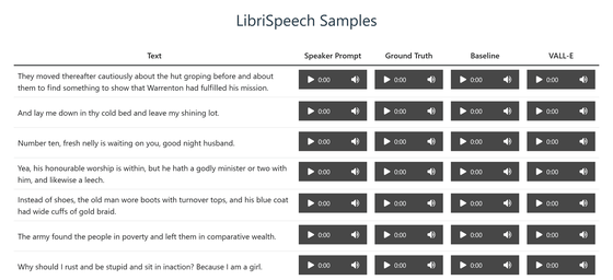 VALL-E 데모 페이지 에서는 실제로 생성된 오디오를 들을 수 있습니다. 아래 이미지의 "Speaker Prompt"는 VALL-E가 학습하는 샘플용 음성으로, 왼쪽에 기재된 텍스트와는 완전히 다른 내용을 극히 짧은 시간만 말하고 있습니다. "Ground Truth"의 음성은 샘플 음성과 동일한 사람이 왼쪽의 텍스트를 읽은 것으로, 이것이 목표가 되는 "정답의 음성"입니다. 「Baseline」이 기존의 AI 모델로 작성한 합성 음성이고,「VALL-E」가 VALL-E로 작성한 합성한 음성입니다. 실제로 듣고 비교해 보면「Baseline」과 「VALL-E」의 차이는 확실하고,「Baseline」은 노이즈가 들어간 것 같은 음성인 반면,「VALL-E」는「Ground Truth」와 비교해도 위화감이 없는 음성인 것에 더해, 음성에 따라서는 숨결의 타이밍등도 「Ground Truth」와 일치하고 있습니다.
