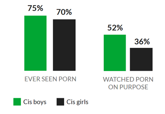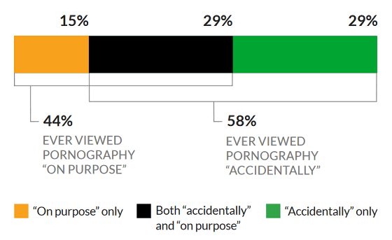 남성의 75%는 포르노를 찾아본 경험이 있었고, 52%는 의도적으로 포르노를 찾았습니다. 또한 여성의 경우 70%가 포르노를 열람했으며, 36%가 의도적으로 포르노를 열람했습니다.