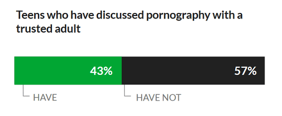 "성인과 포르노 콘텐츠에 대해 토론한 적이 있다."라고 응답한 것은 43%로, 57%는 "성인과 포르노 콘텐츠에 대해 토론한 적이 없다."라고 응답했습니다.