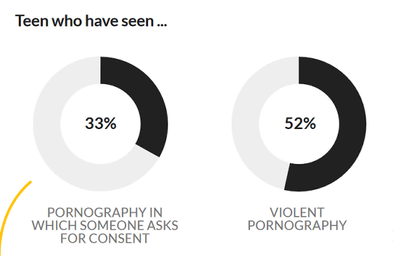 보고 있는 포르노의 종류를 물어본 결과, 동의(허락)에 근거한 포르노 콘텐츠를 열람한 것은 33%, 52%는 폭력적인 행위를 포함한 포르노 콘텐츠를 열람하고 있었습니다.
