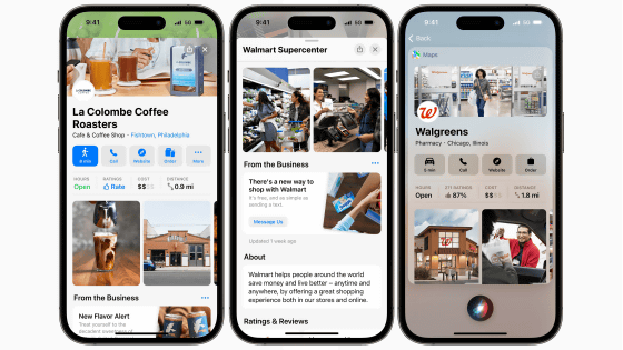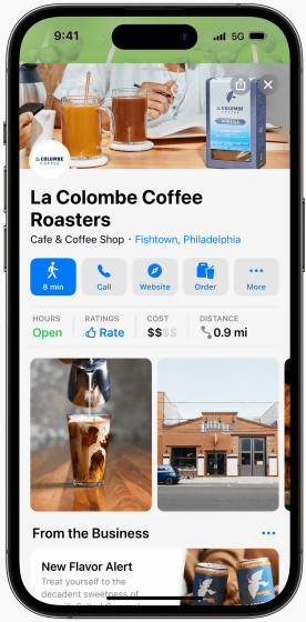 Apple 순정 지도 앱에서 음식점 등을 검색하면 아래와 같이 거리 및 점내의 사진, 리뷰 등을 적은 카드가 표시됩니다. 새로 발표된 Apple Business Connect를 사용하면 상점 소유주가 카드 정보를 편집할 수 있습니다.