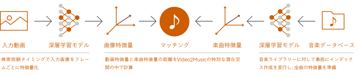 입력영상 → 심층학습모델 → 영상특징량 → 매 칭 ← 악곡특징량 ← 심층학습모델 ← 음악 데이터베이스