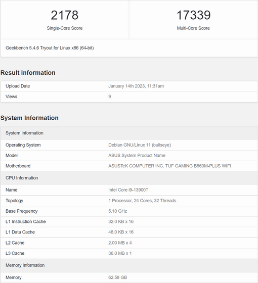 Core i9-13900T는 단일 스레드 테스트에서 2,178점, 멀티 스레드 테스트에서 1만 7,339점을 기록했습니다.