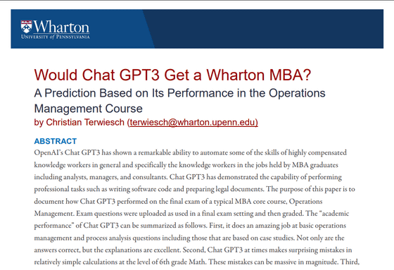 펜실베이니아 대학 와튼스쿨의 연구팀이 OpenAI의 대화형 AI 'ChatGPT'로 같은 대학의 경영학 석사 과정(MBA)의 최종 시험을 치르는 실험을 실시해, ChatGPT가 훌륭하게 합격점을 얻었다고 발표했습니다.