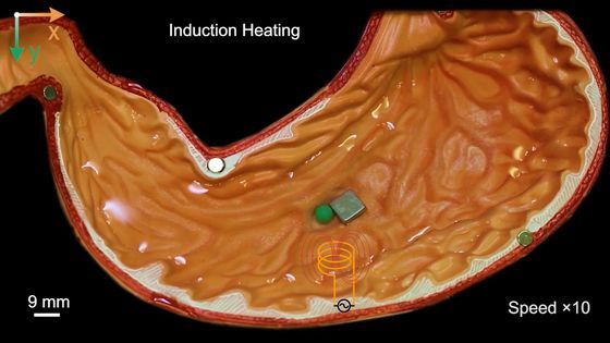 또한 연구팀은 위장을 재현한 모형 안에 넣은 물체를 MPTM을 이용하여 회수하고 위 밖으로 배출해 내는 데모도 실시하고 있습니다.