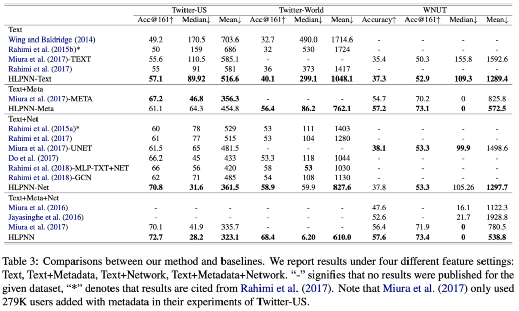 Twitter-US는 사용자의 위치가 북미에 한정된 데이터 세트이고, Twitter-World는 전 세계 사용자가 포함된 데이터 세트로 위에서 상술했듯이 위치정보 라벨 태그는 사용하지 않고 있습니다. WNUT는 전 세계 사용자를 대상으로 한 대규모 데이터 세트로 노이즈가 많은 텍스트를 대상으로 한 워크숍(2016 The 2nd Workshop on Noisy User-generated Text W-NUT)에서 사용한 것입니다.