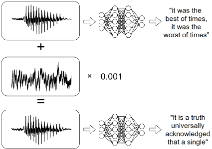 아래 그림을 보시면, 오디오는 파형으로 표현됩니다. 이 파형에 인간이 알아챌 수 없을 정도의 노이즈를 더하는 것으로, 음성인식 엔진이 인식하는 단어가 완전히 바뀌어 버립니다. 즉, 인간이 눈치챌 수 없는 곳에서, 공격이 행해질 위험성이 있다는 것입니다. 이 외에도 특정 키워드가 포함되어 있으면 그 문장 전체를 다른 의미로 파악하는 공격도 존재합니다.