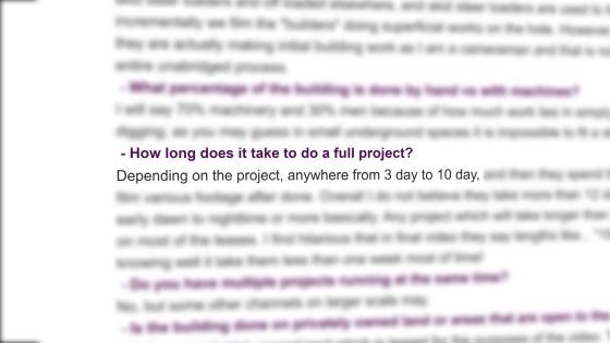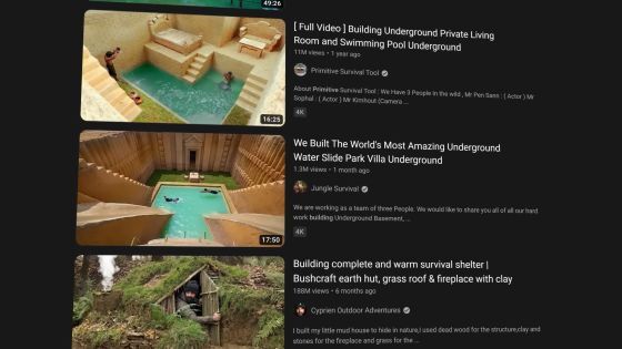 유튜브에「중장비를 사용하지 않고, 맨손으로 흙을 파거나 도구를 만들어, 호화로운 집을 건축하는 영상」이 많이 투고되고 있습니다. 그러나 이러한 영상의 대부분은 가짜이며, 실제로는 많은 인부가 참여하거나 굴삭기와 같은 중장비가 사용되고 있다는 고발 영상이 YouTube 채널 'SunnyV2'에 게시되었습니다.