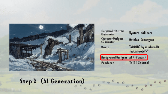 손으로 그린 배경을 바탕으로 AI가 생성한 이미지가 아래. 크레딧에도「Background Designer(배경 디자이너)」가 「AI(+Human)」이라고 적혀 있습니다.