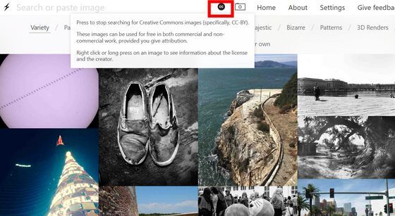 홈 화면 상단에 있는 CC 아이콘을 클릭하면 크리에이티브 커먼즈 라이센스가 부여된 무료로 상업적 이용이 가능한 이미지만 검색할 수도 있습니다.