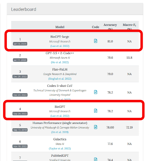 또한 BioGPT는 PubMed가 제공하는 데이터 세트 'PubMedQA'의 벤치마크에서 78.2%의 정확도를 획득하여 인간 전문가의 성능인 78%를 웃돌았습니다. 또, BioGPT를 이용 가능한 최대의 GPT-2 아키텍처에 스케일 업한 「BioGPTLarge」는, 랭킹 1위가 되는 81%의 정밀도를 기록하고 있습니다.