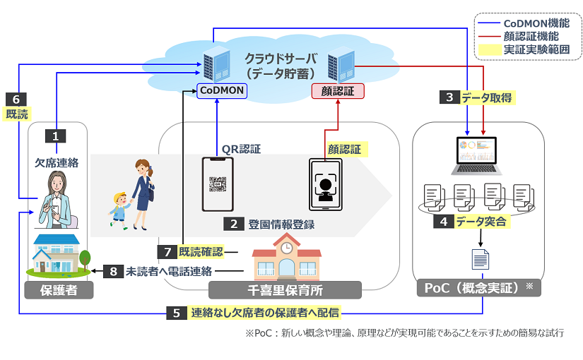 이 실증 실험에서는 ICT 서비스 CoDMON(코드몬)의 QR 코드 스캔을 통한 등원확인 프로세스를 구축하고, 여기에 얼굴 인증 데이터를 사용한 AI 자동인식 기능을 추가하여, 아이에 대한 얼굴 인증의 정밀도 등의 효과를 검증합니다. 이와 함께 CoDMON의 출결 데이터나 통지 기능을 활용하여 예고 없이 결석한 미인증 원아의 보호자에게 메일 통지 및 수신확인 관리 프로세스를 구축합니다. 이로 인해 보육 현장의 DX를 추진하고, 인간의 실수에 기인하는 사고의 발생 리스크를 줄이는 것이 목표라는 것.