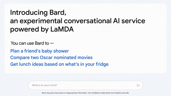 Google이 2021년에 발표한 대화 특화형 AI 'LaMDA'를 이용한 차세대 실험적 대화형 AI 서비스 'Bard'를 발표했습니다. Bard는 앞으로 몇 주 동안 더 널리 공개될 예정이며, 지금은 신뢰 가능한 테스터 만을 위해 공개됩니다.