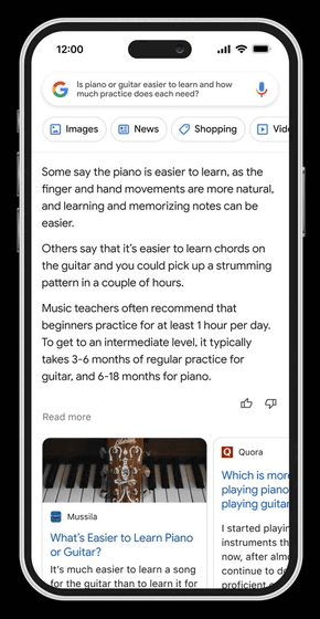 이러한 보다 복잡한 질문에 올바르게 대답하는 데 도움이 되는 것이 AI라고 구글은 지적. AI라면 복잡한 정보와 여러 시작점을 소화하기 쉬운 형식으로 추출하여 웹에서 필요한 지식을 수집하여 사용자에게 올바르게 전달할 수 있습니다. 피아노와 기타를 모두 연주하는 사람의 블로그와 초보자 안내서와 같은 관련 주제를 추천할 수도 있습니다. 이러한 AI를 이용한 보다 고차원의 검색 기능도 Google 검색에서 곧 출시될 예정입니다.