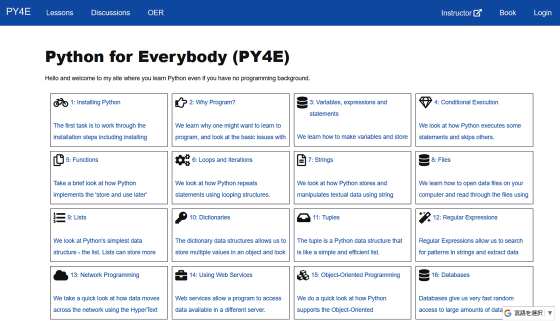 그러면, 초보자를 위한 온라인 교재인 Python for Everyone (PY4E) 웹사이트가 열렸습니다.