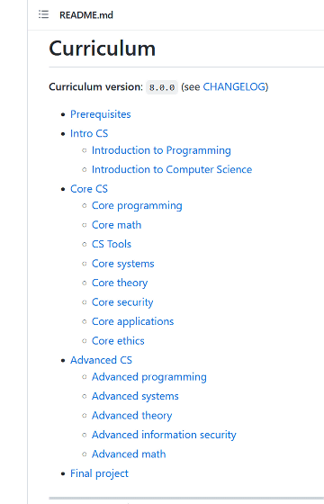다양한 콘텐츠로 구성되어 있으며, 모든 항목을 체계적으로 배우게 되면 대학 학위 수준의 컴퓨터 과학 지식을 습득할 수 있다고 합니다. 교재 자체는 하버드 대학이나 프린스턴 대학, 매사추세츠 공과 대학 등의 대학이 공개하고 있는 콘텐츠가 많고,「누구라도 이용 가능한 것」,「정기적으로 실행할 수 있는 것」,「교육의 관점에서 고품질인 것」,「계산기 협회나 IEEE의 가이드라인에 따른 것」등이 선정 기준이 되었다고 합니다.